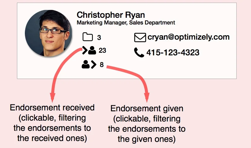 The arrow icon between endorsement writer and endorsement receiver is noticeable above. Its importance is being representation of the endorsement direction. The arrow icon catches the profile viewer at the first glance with less verbal but more visual way.