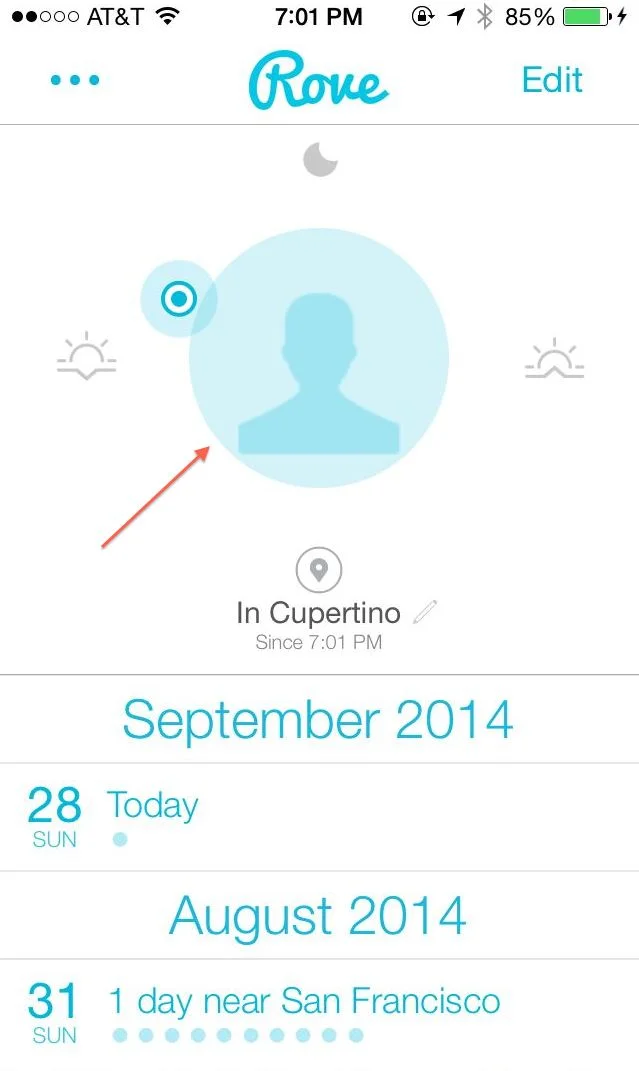 On the main screen the anonymous user image with the time of day icon is almost useless and it spends the most valuable area of the app: top half of the main screen. Users can not find a point of immediate interaction since we put them into the boring settings screen when the top area is clicked. Our most important assets are images and map info. If we can put map with some images from the user's photo library in as a carousel it can be more appealing onboarding.